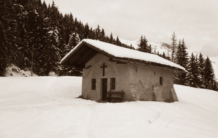 juste là, quand, sur le sentier venant du village de Verthière, j’ai entendu une clochette qui s’approchait. Une lueur passait à travers les sapins et la clochette et la lueur venaient en direction de la chapelle. Au bout de la clairière, j’ai vu ceci, et puis, à quelques mètres devant moi, j’ai vu, mon Père, j’ai vu, j’ai bien vu, il ne faisait pas très sombre, j’ai vu trois enfants silencieux comme des ombres, qui portaient solennellement quelque chose dans les mains. Chacun avait une lanterne pour s’éclairer et j’ai vu leurs visages illuminés. Une couronne était posée sur leur tête. Par derrière ces trois messagers, un bambin, roulant à chaque pas dans la neige, tirait une chèvre qui ne voulait pas avancer. Le cortège est passé à pas cinq mètres de moi et j’ai vu la chèvre, harnachée de rubans, avec une sonnette et, sur les reins, une vieille descente de lit, je crois, qui pendait de chaque côté. Toute la petite caravane est entrée dans la chapelle de S. Christophe.