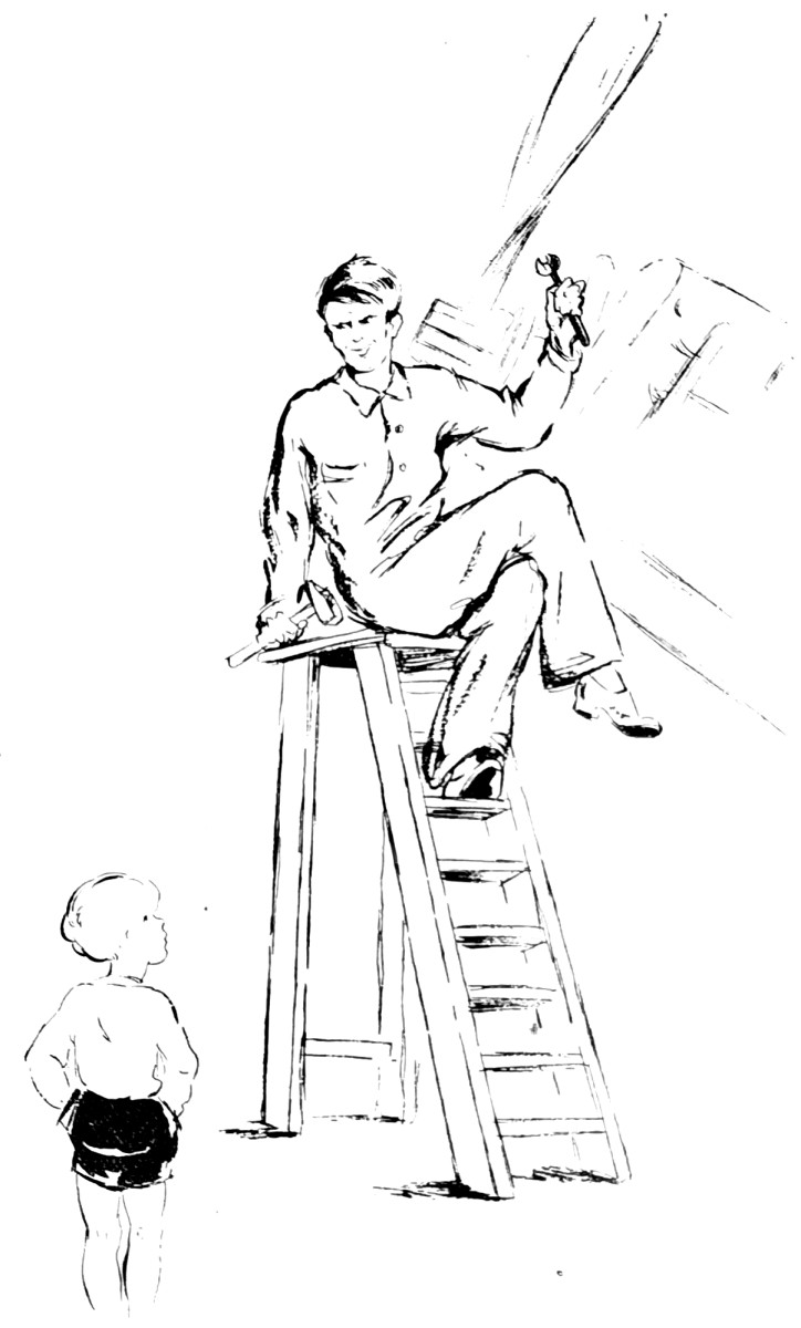 Bernard monte et descend de son échelle, va, vient, sans s’apercevoir de la présence du petit homme, jusqu’au moment où, dans un mouvement de recul, il le heurte brusquement. Alors il grossit sa voix pour dominer le ronflement du moteur et lui crie, non sans impatience :