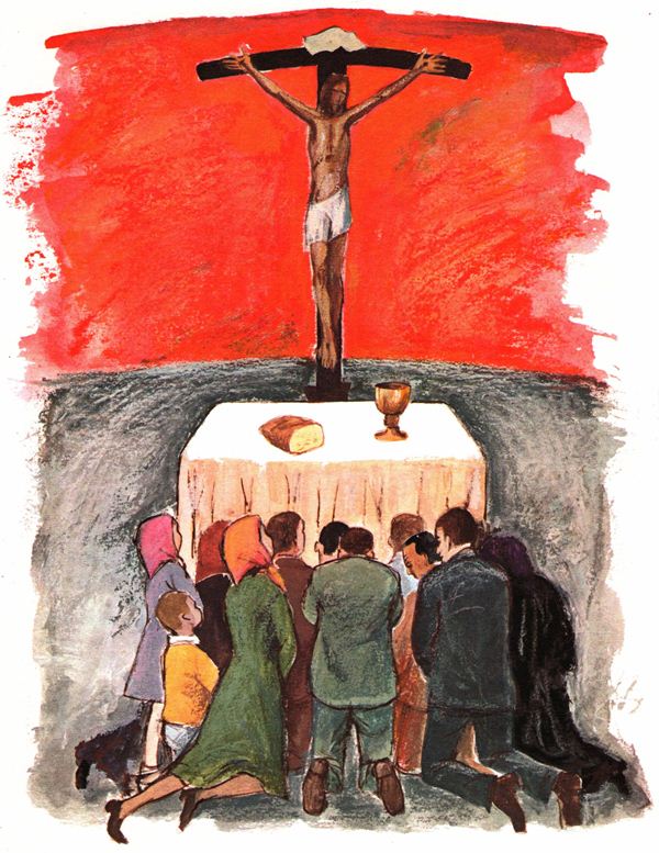 Le Père — C’est bien vrai ! Mais pour­quoi est-il mort sur la croix ? Il nous l’a dit : « pour ras­sem­bler tous les enfants de Dieu dis­per­sés ». Par son sacri­fice du Cal­vaire il les a réunis en un seul Corps, son Corps, ce qu’on appelle l’É­glise. C’est pour­quoi, depuis qu’il est mort — et res­sus­ci­té —, Jésus ne peut plus offrir son sacri­fice tout seul. Son sacri­fice est en même temps celui de l’É­glise, qui l’offre avec lui.