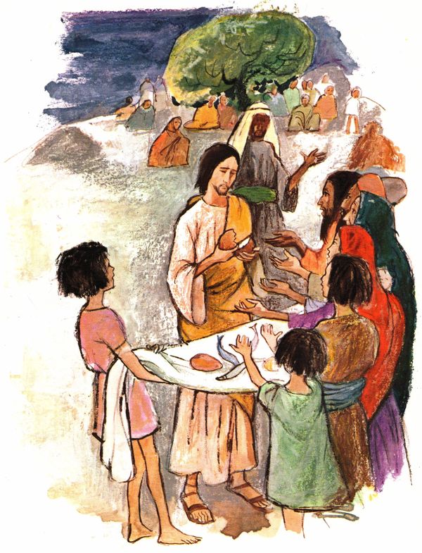 Le Père — Bravo. Dans un repas, on ne se contente pas de manger à part, égoïstement, comme si on était seul. On partage le même pain, les mêmes plats. On parle les uns avec les autres. C’est ainsi qu’à la messe on ne se contente pas de recevoir Jésus pour soi tout seul (comme une personne malade qui, au début du dîner, prend un médicament pour elle toute seule) : on reçoit Jésus tous ensemble, à la même table, après le prêtre, qui rompt et qui distribue le Corps du Christ à ceux qui veulent devenir de plus en plus unis à Jésus et entre eux, en ne faisant qu’un seul Corps.
