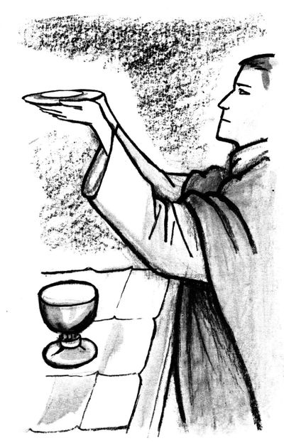 Le Père — Voilà donc, sur l’autel, le pain et le vin devenus le corps immolé et le sang répandu de Jésus-Christ. Qu’est-ce qu’on va en faire ?