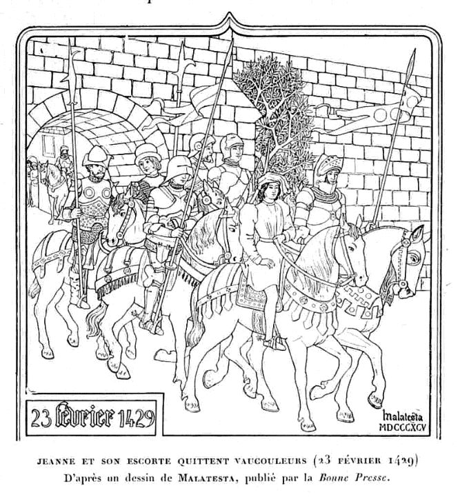 Un jour, elle revient à lui. L’heure a sonné, et les voix du ciel l’ont annoncée. « Ne tardez plus, Messire, au nom de Dieu ! Car aujourd’hui même, près d’Orléans,le Dauphin a subi grand dommage. Si vous ne m’envoyez à lui, bientôt il en aura plus grand encore. » C’était le 12 février 1429. Le même jour, — la nouvelle en parvint à Vaucouleurs une semaine plus tard,— l’armée de secours envoyée pour ravitailler Orléans, avec tout un chargement de vivres, de légumes, de harengs, avait été surprise par les Anglais et détruite.