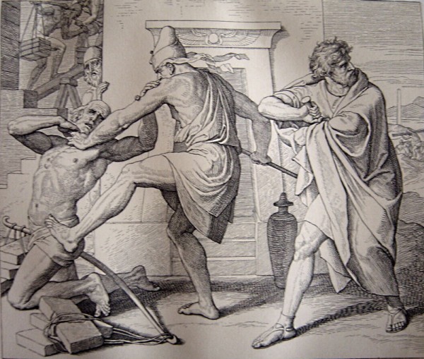 Voyons, tu ne sais plus que, pour avoir éner­gi­que­ment défen­du un Hébreu, frap­pé par un Égyp­tien, Moïse fut condam­né à mort ?