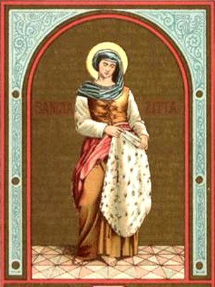 Zite, une pauvre ser­vante, a enten­du, du fond du palais où elle sert, les joyeux échos de ces bruits paci­fiques. Fleur des mon­tagnes trans­plan­tée dans la cité, elle a appor­té dans la demeure de ses maîtres le doux par­fum du lieu natal. Elle est si pure que sa modeste chambre est, dit-on, illu­mi­née de clar­tés célestes : si cha­ri­table que, pour répa­rer les impru­dences de sa géné­ro­si­té, Dieu, plus d’une fois, a dû venir à son secours. Son angé­lique pié­té l’a ren­due chère à ses maîtres pieux. Ils en ont fait la dis­pen­sa­trice de leurs aumônes : les pauvres se sont suc­cé­dé au seuil du palais, pour rece­voir de ses mains vir­gi­nales le pain qui nour­rit et le vête­ment qui réchauffe. Aux lar­gesses de ses maîtres, elle a vou­lu ajou­ter les siennes et faire l’aumône de sa pau­vre­té. Zite a tout dis­tri­bué, jusqu’à ses propres vête­ments d’hiver.