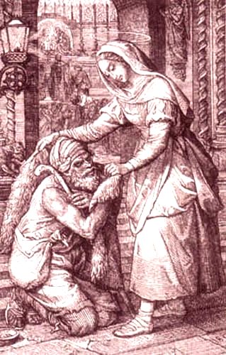 Les Anges, témoins de son géné­reux sacri­fice, l’ont por­té devant le trône de Dieu, et lui apportent, en échange, une céleste ins­pi­ra­tion. Elle retourne vers le pauvre du bon Dieu. « Tiens, lui dit-elle, image souf­frante du Christ ; reçois de mes indignes mains ce magni­fique man­teau. C’est celui de mon puis­sant maître, le sei­gneur de Fati­nel­li. Il m’en a confié le soin et j’ai pro­mis de le rap­por­ter. Mais la nuit est gla­cée ; l’office sera long ; le chant des hymnes sacrés dure­ra jusqu’au matin. Tu en abri­te­ras, jusqu’à cette heure, tes membres engour­dis par le froid, et je le repren­drai, demain, en sor­tant de la mai­son de Dieu. »