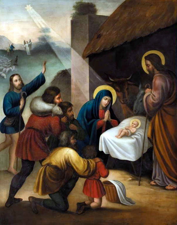 Voi­là bien ses murs déla­brés et sa porte ver­mou­lue… Là, dans un angle obs­cur, est la pauvre crèche, humble ber­ceau de l’Enfant-Dieu… Tout près, la pierre mira­cu­leuse où il repo­se­ra sa tête… Joseph et Marie attendent dans le ravis­se­ment l’heure solen­nelle où les Anges diront aux pas­teurs : « Aujourd’hui, un petit enfant vous est né. » Au dehors, comme pour ache­ver le tableau, se des­sinent les coteaux de Beth­léem et le sépulcre de Rachel. Enfin le Verbe fait chair appa­raît. Saint Joseph le presse dans ses bras et le couche sur un peu de paille. La Vierge Marie détache son voile de lin, pour com­po­ser ses pre­miers langes. Le bœuf et l’âne flé­chissent le genou devant leur maître, avant de le réchauf­fer de leur haleine. Les chœurs des Anges viennent tour à tour l’adorer. Les ber­gers, aver­tis par les célestes mes­sa­gers, lui apportent leurs modestes pré­sents, et les Mages, gui­dés par l’étoile, lui pré­sentent leurs riches offrandes.