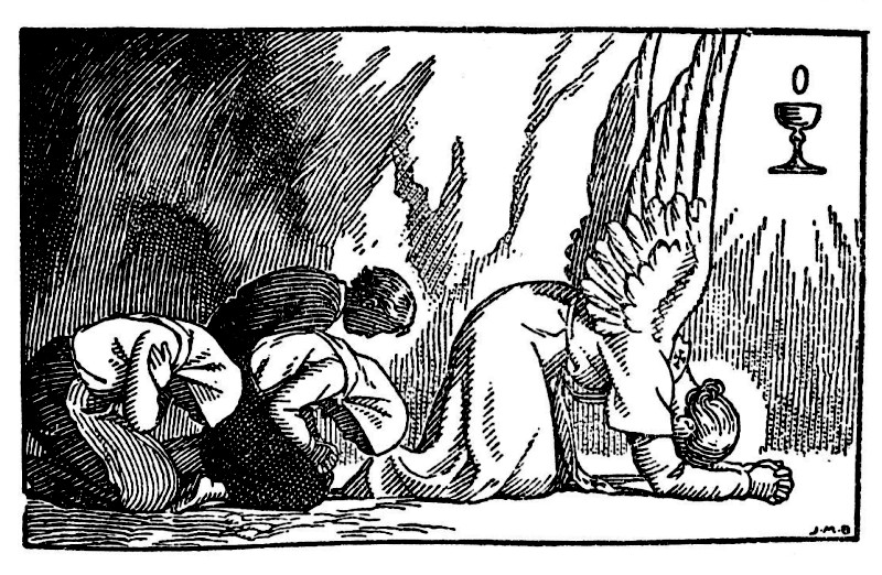 Enfin, au cours de l’automne, dans la grotte du Cabeço, où les bergers viennent de réciter le chapelet, une clarté extraordinaire les enveloppe. L’Ange est là, devant eux… Il tient dans la main un calice, et, au-dessus, une hostie de laquelle tombent des gouttes de sang qui coulent dans le calice. Laissant le calice et l’hostie suspendus en l’air, l’Ange s’agenouille à côté des enfants et leur fait répéter trois fois : « Très Sainte Trinité, Père, Fils et Saint-Esprit, je vous adore profondément et je vous offre les très précieux Corps, Sang, Âme et Divinité de Notre-Seigneur Jésus-Christ, présent dans tous les tabernacles du monde, en réparation des outrages par lesquels il est lui-même offensé.