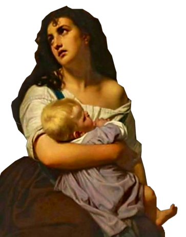 L’enfant divin qu’elle porte sur l’un de ses bras, et semble serrer contre elle, ainsi que l’étrangère en fuite étreignait le sien sur sa poitrine, c’est aussi le visage pâle et beau du doux chérubin blond mourant d’inanition.