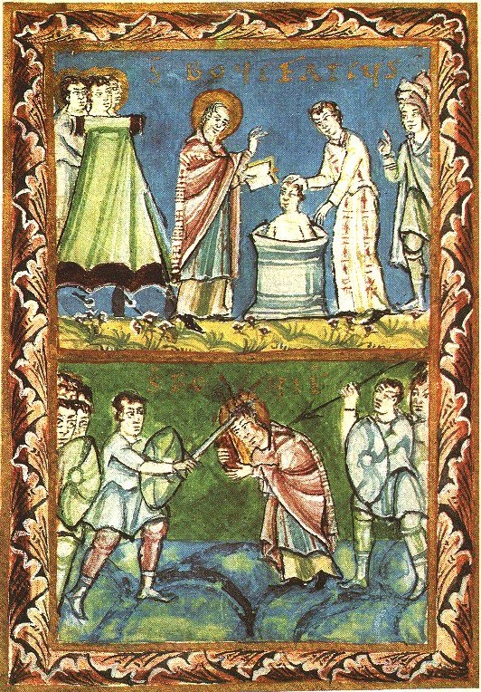 Son corps fut transporté à Fulda. Une foule immense lui fit escorte jusqu’au lieu qu’il avait choisi pour son repos. Et l’on peut voir, dans la bibliothèque de Fulda, le livre que l’épée avait entaillé, et où se perçoivent encore des taches de sang.