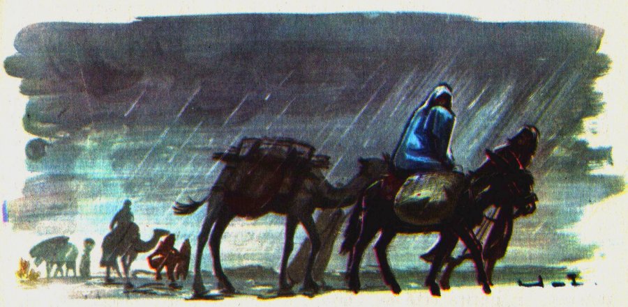 L’âme meurtrie mais calme, Joseph prépare tout. Dans la double besace de l’âne — le petit âne gris, sobre et vaillant, de tous les foyers populaires — il range d’un côté ses outils, de l’autre les langes, les provisions. Marie prendra place en arrière du bât. Et ils partent, par la plaine d’Esdrelon, l’inhospitalière Samarie. Routes noires de chars, de chameaux, encombrements. Au nord du Jourdain, les chemins noyés de pluie ressemblent à des affluents du fleuve. Ciel brumeux et bas. Joseph, la bride de l’âne dans sa main, suit, ses vêtements maculés de boue, le bord du chemin, se garant des bruyants attelages.