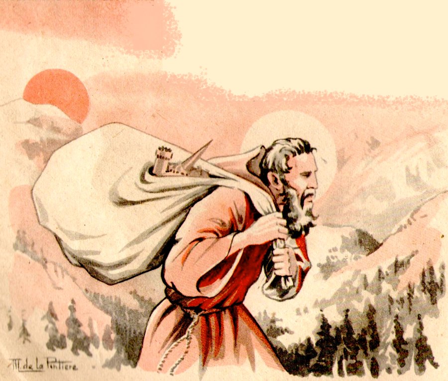 Voilà donc saint Eynard, muni d’un grand sac et qui puise inlassablement dans les docks du ciel ; châteaux-forts à tourelles, donjons crénelés, manoirs, chaumières au toit de paille, clochers aux campaniles aigus s’entassent… Saint Eynard… charge le sac sur ses épaules ; il part.