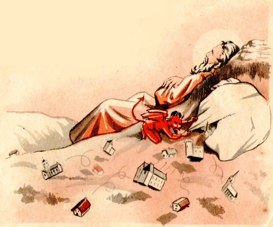 Alors, le diable, suivi d’une légion de diablotins… s’approche à pas de loup et, sournoisement :