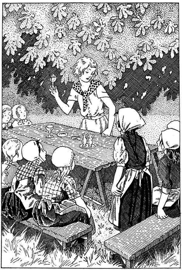 Munie de toutes les permissions voulues, Colette, aidée d’Annie, organise sous les marronniers une salle d’étude champêtre. Les garçons ont apporté les bancs de l’école et fabriqué, avec des planches et des tréteaux, une table sur laquelle s’étalent, en miniature, les objets nécessaires à la messe.