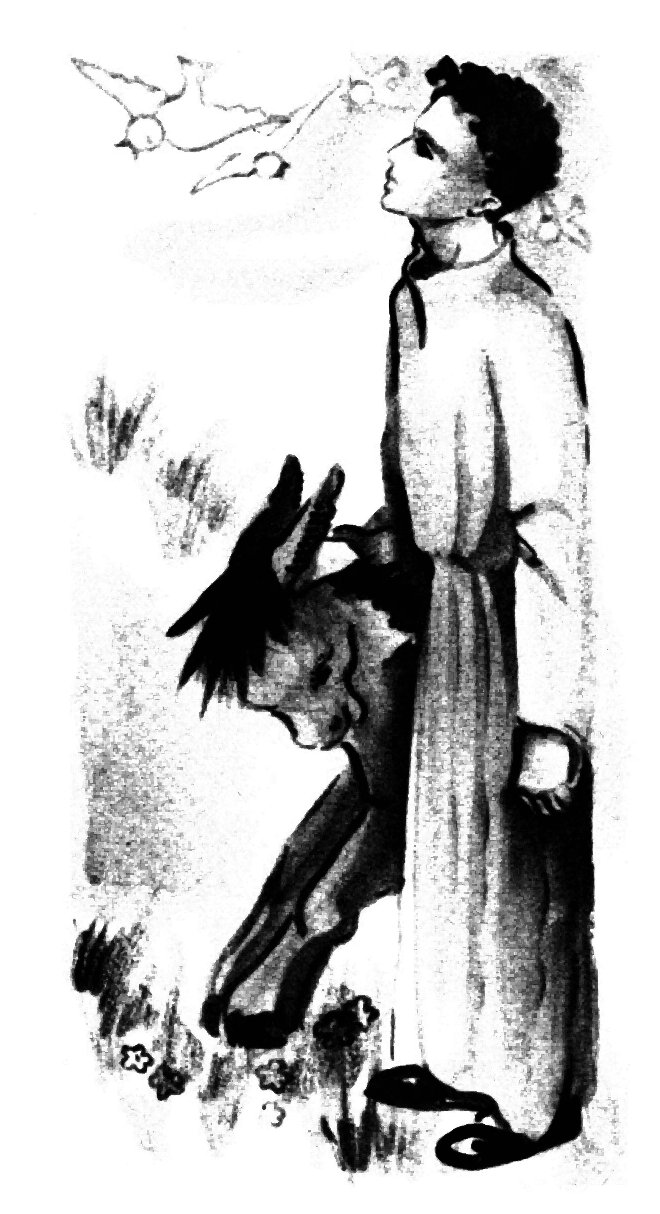 Marie et Joseph, assis à l’en­trée de la grotte, goû­taient la paix du soir et contem­plaient Jésus, endor­mi en suçant son pouce. Un grand vol de pigeons, tour­noyant autour de la grotte, lui tra­çait une auréole mou­vante et soyeuse. Sou­dain, l’âne, qui pais­sait pai­si­ble­ment, dres­sa d’a­bord l’o­reille, puis la queue, puis, trem­blant, s’arc-bou­ta sur les quatre pattes. Les pigeons élar­girent leur ronde et se déployèrent en une large roue au-des­sus du che­min creux dont le fos­sé borde l’étable.