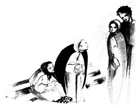Tou­jours cha­ri­table, elle pré­fé­rait son­ger aux autres plu­tôt qu’à elle-même, car déjà fati­guée, elle était très inquiète au sujet de Jésus. Elle ne l’a­vait pas encore recon­nu dans les groupes joyeux qui la croi­saient au pas­sage. Aus­si dès l’é­tape, lors­qu’elle eut assis sa vieille sur un man­teau plié au bord du fos­sé, près d’un bon feu où cui­sait un appé­tis­sant ragoût, elle alla de groupe en groupe deman­der des nou­velles de son fils. Per­sonne ne l’a­vait vu.