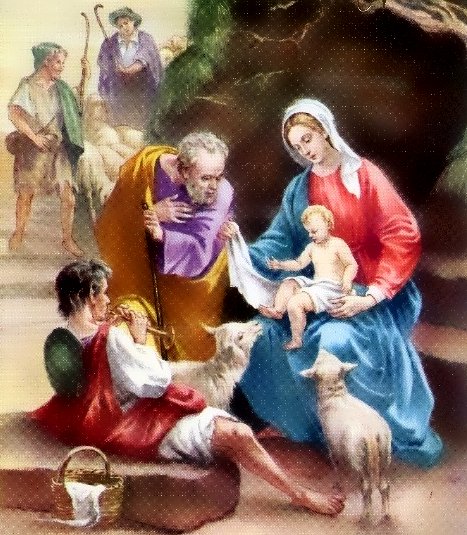 Le jeune berger se mit à courir au-devant de la lumière. Sous son manteau, tout contre sa poitrine, il sentait sa flûte. Il arriva le premier et regarda l’Enfant nouveau-né. Celui-ci, enveloppé de langes reposait dans une mangeoire. Un homme et une femme le contemplaient, tout heureux. Le grand-père et les autres bergers arrivèrent bientôt et tombèrent à genoux devant l’Enfant.