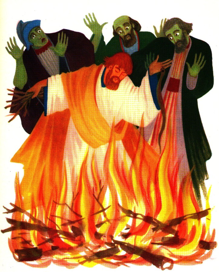 Et il en fut ainsi ! Après une si affreuse épreuve, le navire arriva à l’île de Malte. Là un autre épisode montra que Paul était vraiment un homme de Dieu. Jetés à la côte par la tempête, les naufragés firent un grand feu pour se sécher. Soudain, d’une brassée de bois qu’il jetait dans les flammes, jaillit une vipère, qui planta ses crocs dans la main de l’apôtre. Toute l’assistance regarda avec épouvante cet homme si visiblement maudit du ciel que la Justice divine allait le faire mourir par le poison au moment même où il venait d’échapper au naufrage. Toujours imperturbable, l’Apôtre secoua la main au-dessus des flammes et la bête y tomba sans que lui-même eut aucun mal.