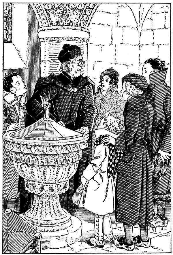 — Quand il sera suf­fi­sam­ment ins­truit, mon petit. Pour l’instant, je réclame encore toute votre atten­tion, mes enfants. Les céré­mo­nies pré­pa­ra­toires au bap­tême sont ter­mi­nées. Avance, Pier­rot, entre dans l’enceinte des fonts bap­tis­maux.