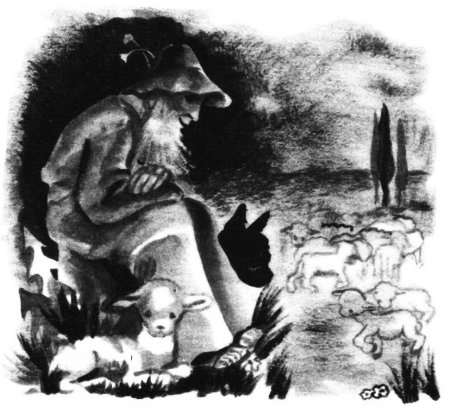 En ce temps-là, la Palestine possédait de vastes régions couvertes d’une herbe drue et sèche, dont se nourrissaient d’innombrables troupeaux de moutons. Comme il eût été dangereux de les laisser ainsi se promener seuls, des bergers les accompagnaient. Vêtus d’une houppelande brune ou verdâtre, appuyés sur un long bâton terminé par une petite bêche et qu’on nomme une houlette, ils restaient de longs mois loin de chez eux, passant la journée en plein air à surveiller leurs troupeaux. Le soir, assis en cercle autour d’un feu, ils se racontaient des histoires sous le beau ciel clair d’Orient. C’est eux que Joachim alla rejoindre lorsqu’il eut quitté sa femme et sa blanche petite maison. Les bergers étaient de braves gens, pas curieux. Ils le reçurent sans rien lui demander. Alors, en gardant les moutons, Joachim pensait au Bon Dieu, à Anne, sa femme, au petit enfant qu’ils voudraient tant avoir ; et ses journées et parfois même ses nuits n’étaient qu’une longue prière.