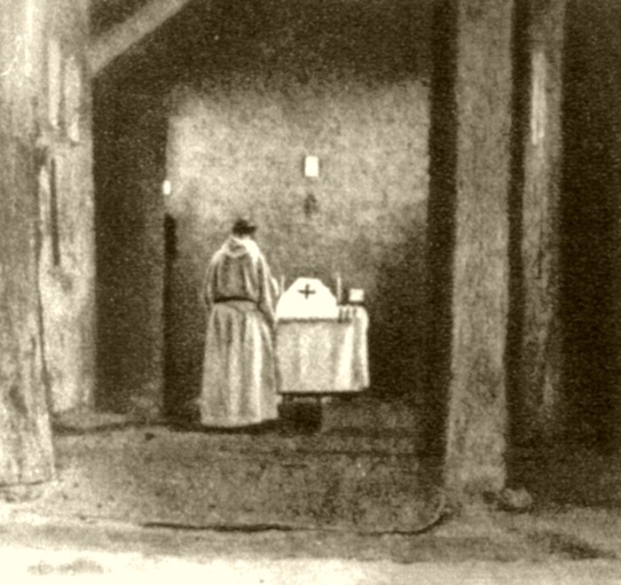 Vous vous rappelez ces audacieux du moyen âge, dont plus haut nous parlions, et qui en Tunisie, en Algérie, au Maroc, affrontèrent la mort, et l’accueillaient en défiant Mahomet par leurs prédications sur le Christ. Tout autre fut l’audace du Père de Foucauld : son plan, à lui, fut de promener et d’installer, en des parages où jusque-là l’Islam était seul à régner, un Christ humilié, anéanti, silencieux pour les oreilles humaines, mais pas toujours pour les âmes, le Christ eucharistique. Messager du Christ, il voulait l’être ; il le serait, avec l’Hostie et par l’Hostie ; la première chaire qu’il lui plut d’ériger, c’était un tabernacle. Son recueillement comptait, avant tout, sur l’éloquence de son Dieu.