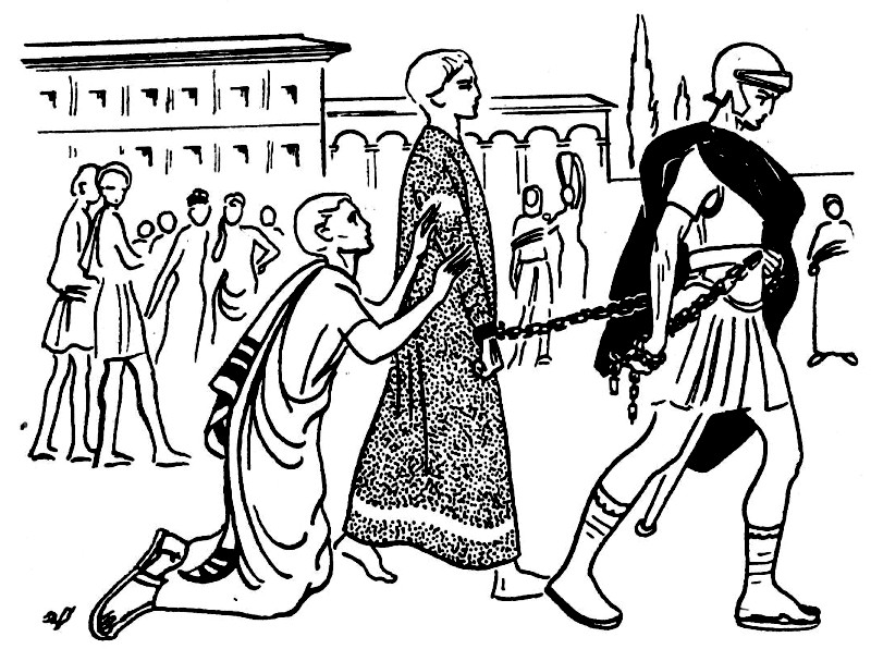 Saprice ne le regarde même pas. Arrivé au lieu de l’exécution, Nécéphore tombe aux genoux de celui qui va mourir, et malgré les moqueries, il s’accuse encore, il supplie : « Ami, pardonne-moi au nom du Christ ! »