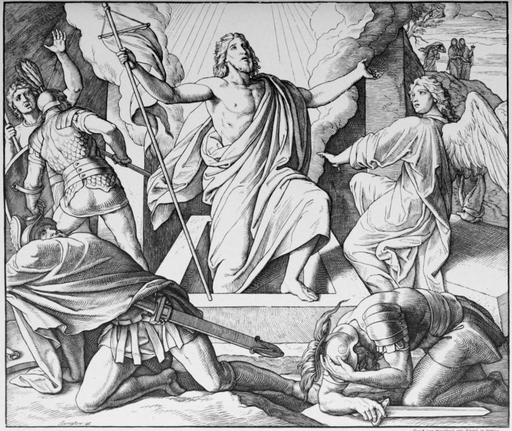 Ses vêtements blancs étincelaient de lumière, son visage était calme et beau. Les femmes, cependant, regardent à l’intérieur du tombeau et s’étonnent de le trouver vide.