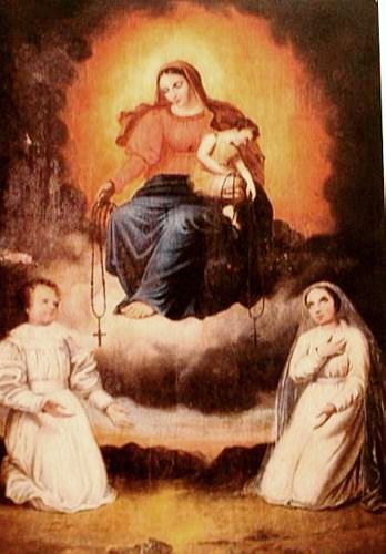 Vierge à l’En­fant qui donne un Rosaire à deux enfants