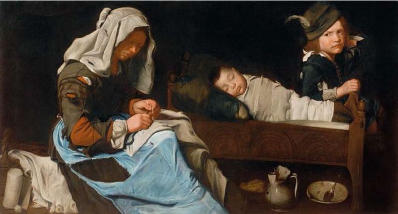 Il se trouva dans une chambre bien mal garnie, mais très propre. Une femme, jeune encore, mais pâle et maigre, cousait avec acharnement près d’une table où brûlait une unique chandelle. Près du feu se tenait deux petits enfants, jolis, bien que délicats, qui regardaient Jésus avec leurs grands yeux étonnés.